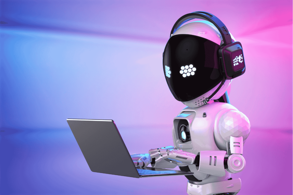 Persona revisando campañas en una laptop mientras un cerebro de inteligencia artificial conecta con los logos de Facebook e Instagram