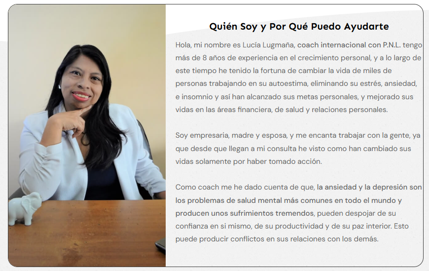 El curso 5 Claves para Terminar con la Ansiedad es un programa online de desarrollo personal y bienestar emocional creado por Lucía Lugmaña, coach certificada en Programación Neurolingüística (PNL), con más de una década de experiencia guiando a personas en procesos de cambio mental y emocional.