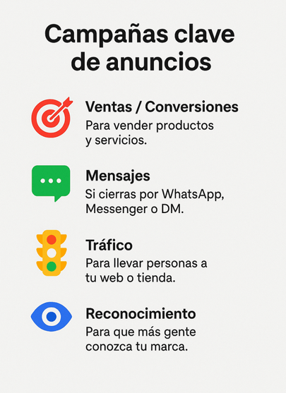 Ideal si vendes por WhatsApp, Messenger o Instagram DM. El objetivo es que te escriban para pedir información o cerrar ventas.Campañas de ventas / conversiones